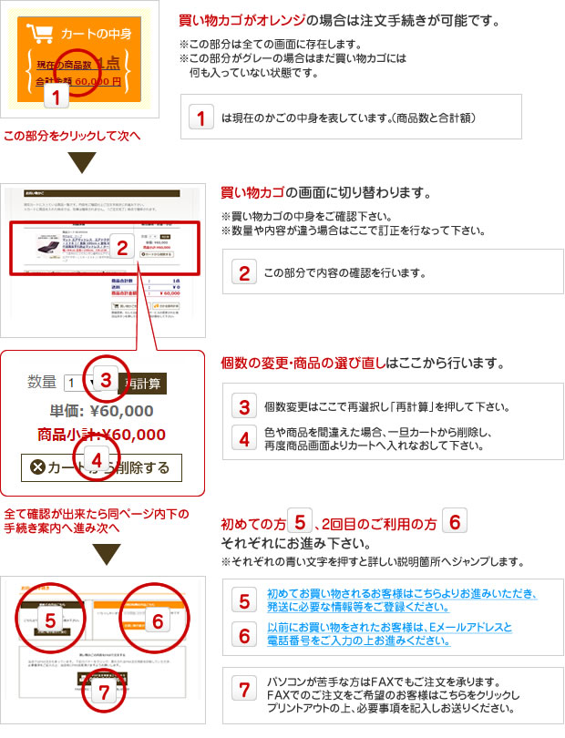 ご注文手順 <番号順(1〜8)に手順を行うと商品をご購入いただけます>